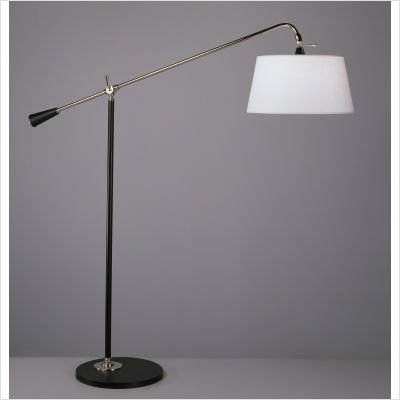 From Robert Abbey, this adjustable floor lamp is great for task lighting or for brightening seating areas. A full range dimmer provides a wide range of brightness options. The metal frame gets a matte black powder coat finish and polished nickel accents. An oyster linen shade completes the look. Matte black powder coat finish. Polished nickel accents. Oyster linen shade. Full range dimmer. Takes one 150 watt bulb (not included). Adjusts from 59 1/2" to 76" high. Shade is 20 1/2" wide.