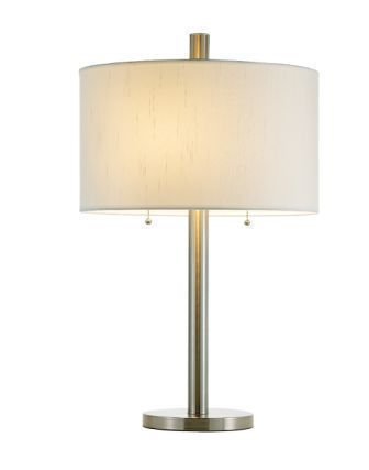 - Chunky satin steel pole, flat round base; white silk-like drum shade and matching finial Has 2 ball-accented pull chain sockets; uses 2 100-watt bulbs